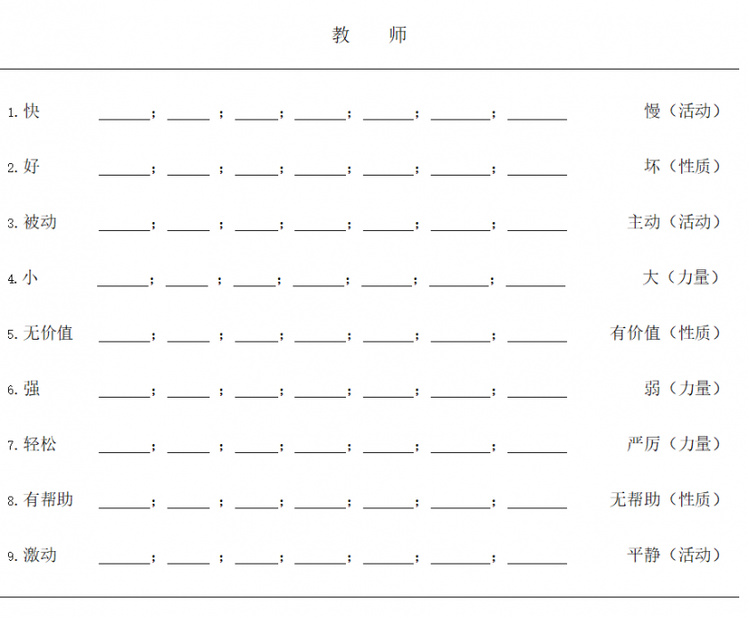 这是一种测量心理意义的有用工具。这种量表最早由Osgood于1957年研创,其经典方法是在一个三维语义空间中来评价被测者对某个具体或抽象事物或概念的态度。研究表明通常用3个维度就能够解释大部分变异,这3个维度分别是:性质(例如好-坏)、力量(例如强-弱)和活动(例如快-慢)。在设计量表时需要为被评估的某个内容或概念设计3-15组意义相反的形容词,每组都要包含这3个维度(分量表),最少也要设计3组。下面是一个对教师进行评价的举例: