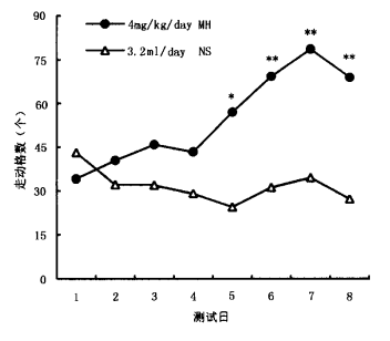 图X MH组及对照组每天给药后活动性高峰的变化趋势