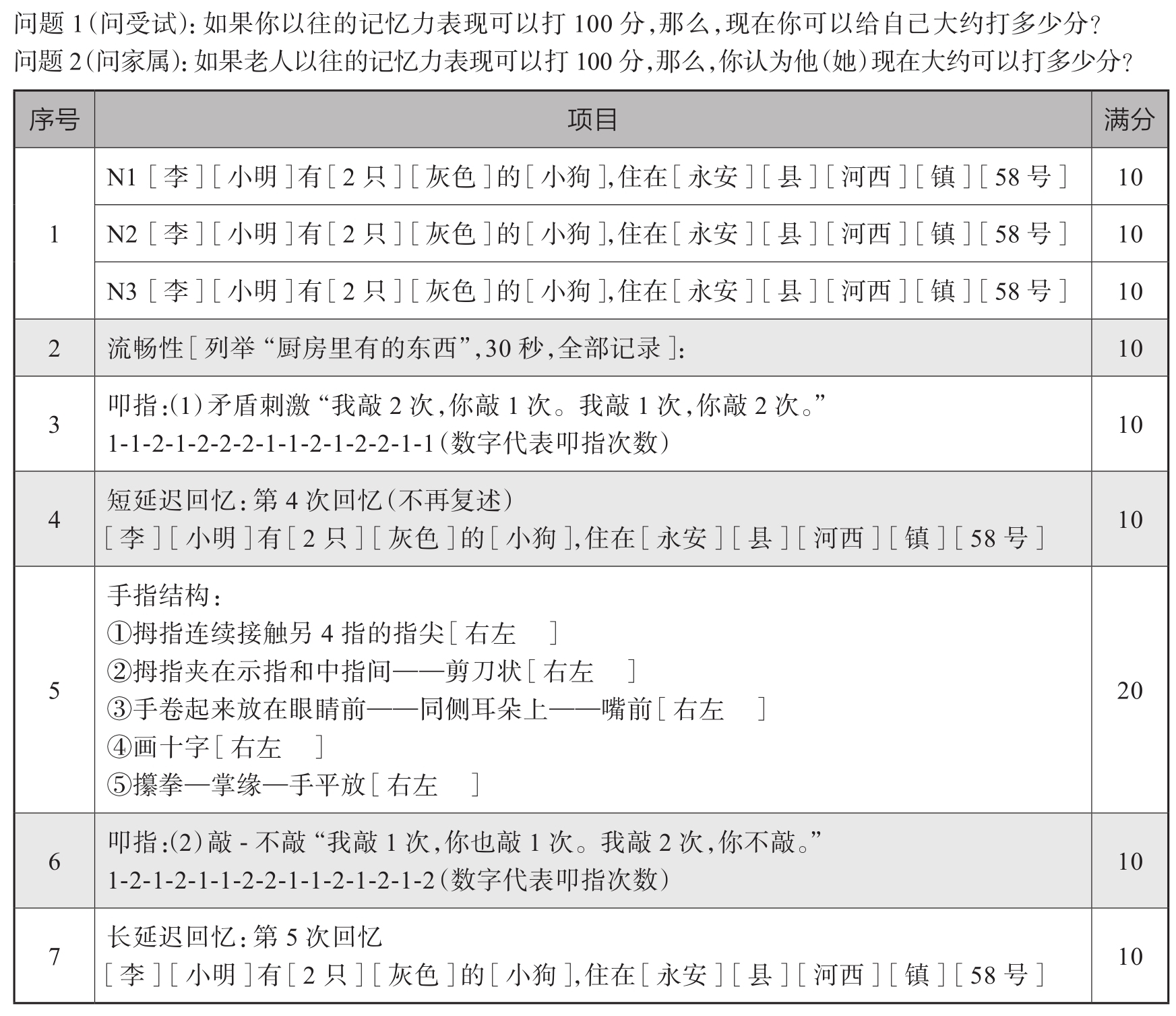 理想的针对MCI的认知筛查工具应简明、耗时短、易操作,并且不受教育程度、文化背景、语言习惯、城乡差异等各种混杂因素影响,能够反映其最突出最主要的认知损害领域。由于在7大认知领域(记忆、语言、空间、注意、执行、运用以及社会认知)中,MCI受试者最常受损的是记忆与执行功能,所以,选择这2个认知域进行评估效率最高。