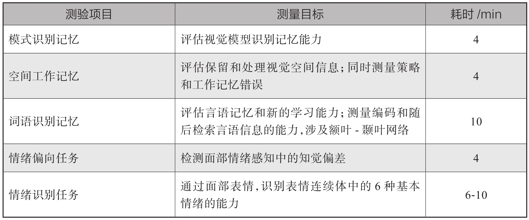 到目前为止,CANTAB是最有效和使用最广泛的计算机化认知成套测验,其认知测验维度包括:注意力和心理运动速度、执行功能、记忆、情绪与社会认知四部分。