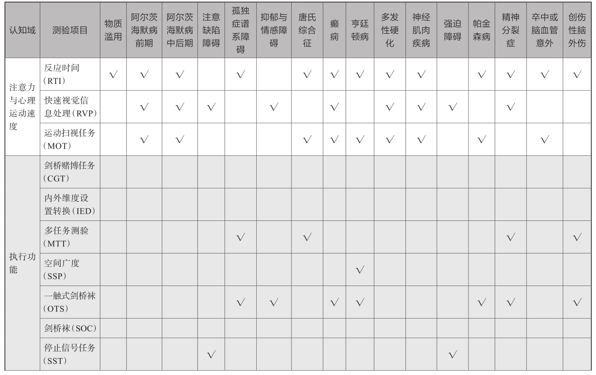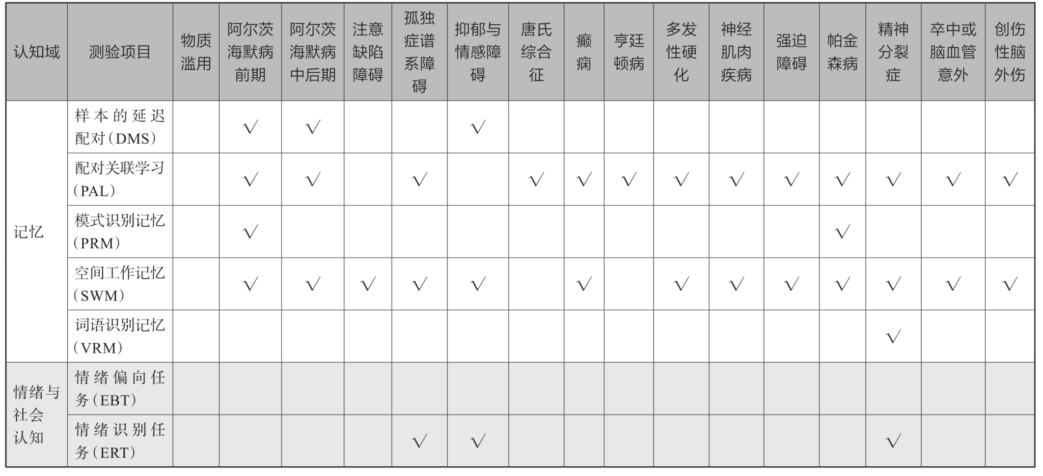 表14-8-2 临床疾病推荐CANTAB测验项目