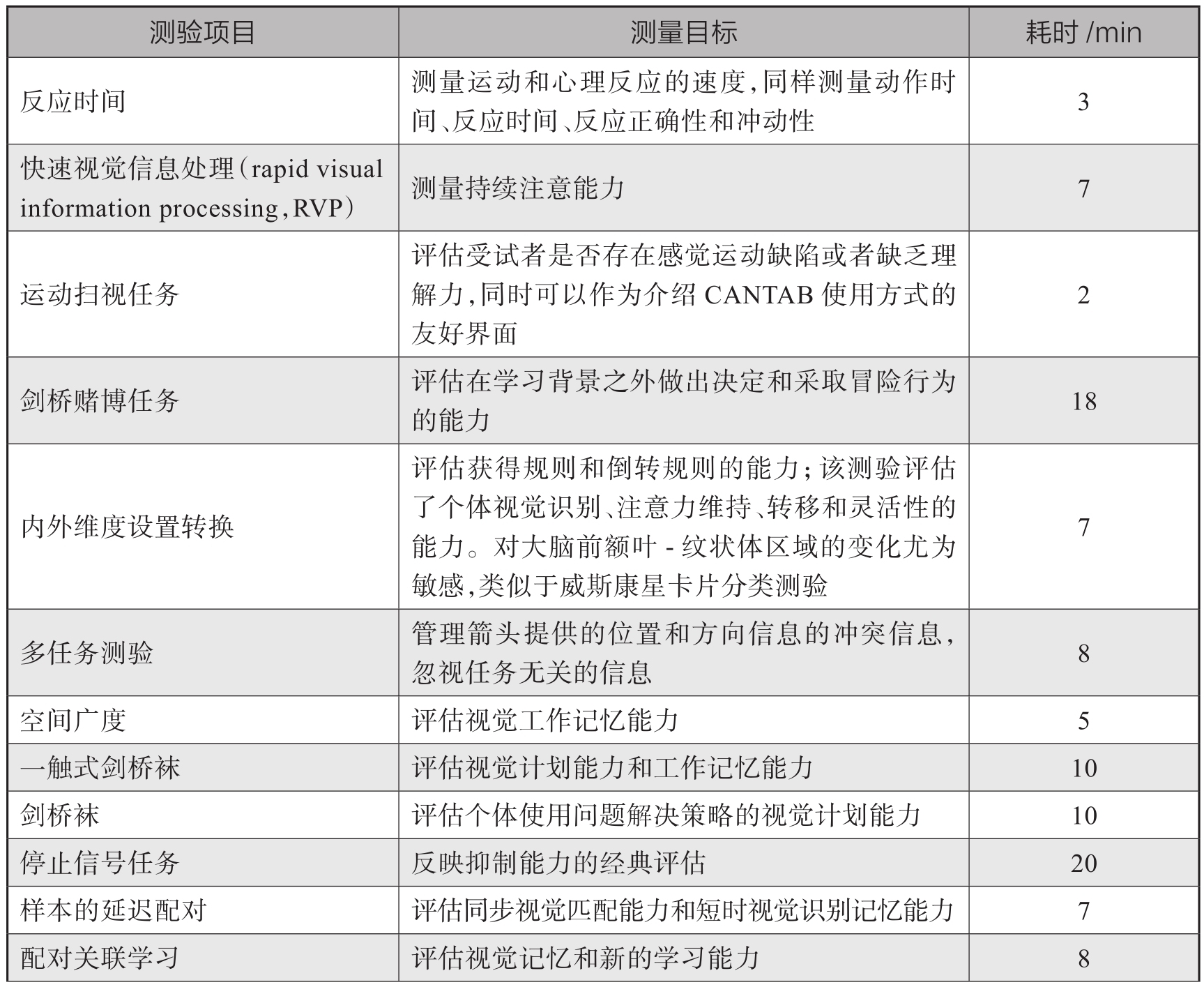 表14-8-1 不同测验项目测量目标与耗时