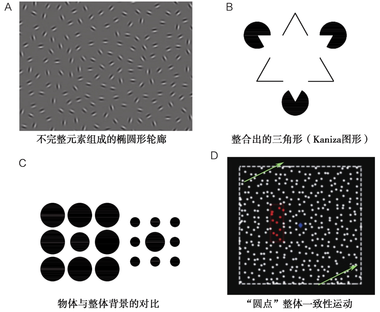 在一系列位置随机的视觉元素组成的场景中,部分元素的排列可以组成特定图形的轮廓,如直线、椭圆等(图3-1-1A),检验受试者能否排除干扰识别出相应轮廓。此外,还常用Kaniza图形作为测验材料,该图形由不连续的线条和面组成(图3-1-1B),尽管刺激本身无轮廓,但可以根据知觉经验“无中生有”加工出轮廓,因此称为主观轮廓或者幻觉轮廓。