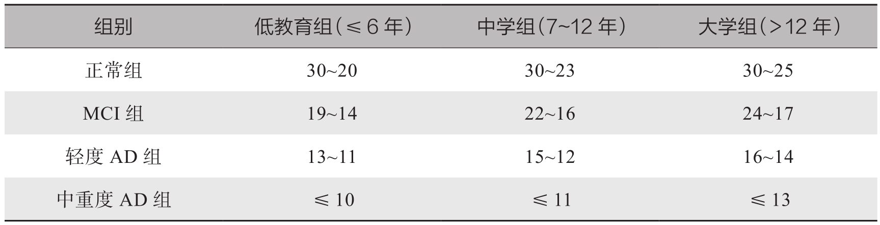 表2-2-1 MoCA-B中文版区分正常组、MCI组、轻度AD组、中重度AD组的分界值