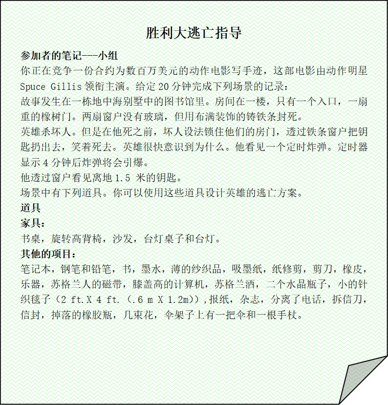这项练习把团队置身于需要创造性思维的环境,同时评估它自身的创造性的解决问题的能力,尤其是发展和综合各种思想的能力。